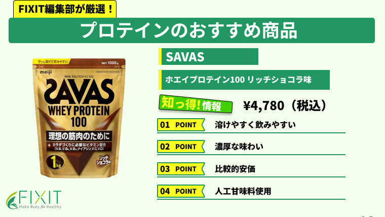 飲みやすいココア味。基本的なタンパク質の他にビタミンが豊富に配合されているのが嬉しいポイントです。プロテイン初心者におすすめの商品となっております。ザバス(SAVAS) ホエイプロテイン100 リッチショコラ味 1000g 明治の良いところと気になるところ